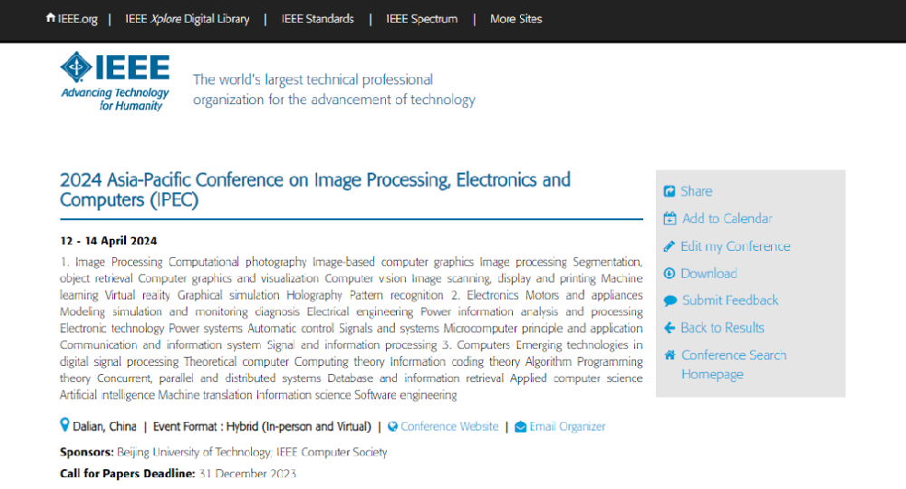 2026 International Conference on Image Processing, Electronic Technology and Computer Science 2026 (IPEC 2026) will be held in Dalian, Liaoning Province, China during May 22-24, 2026.